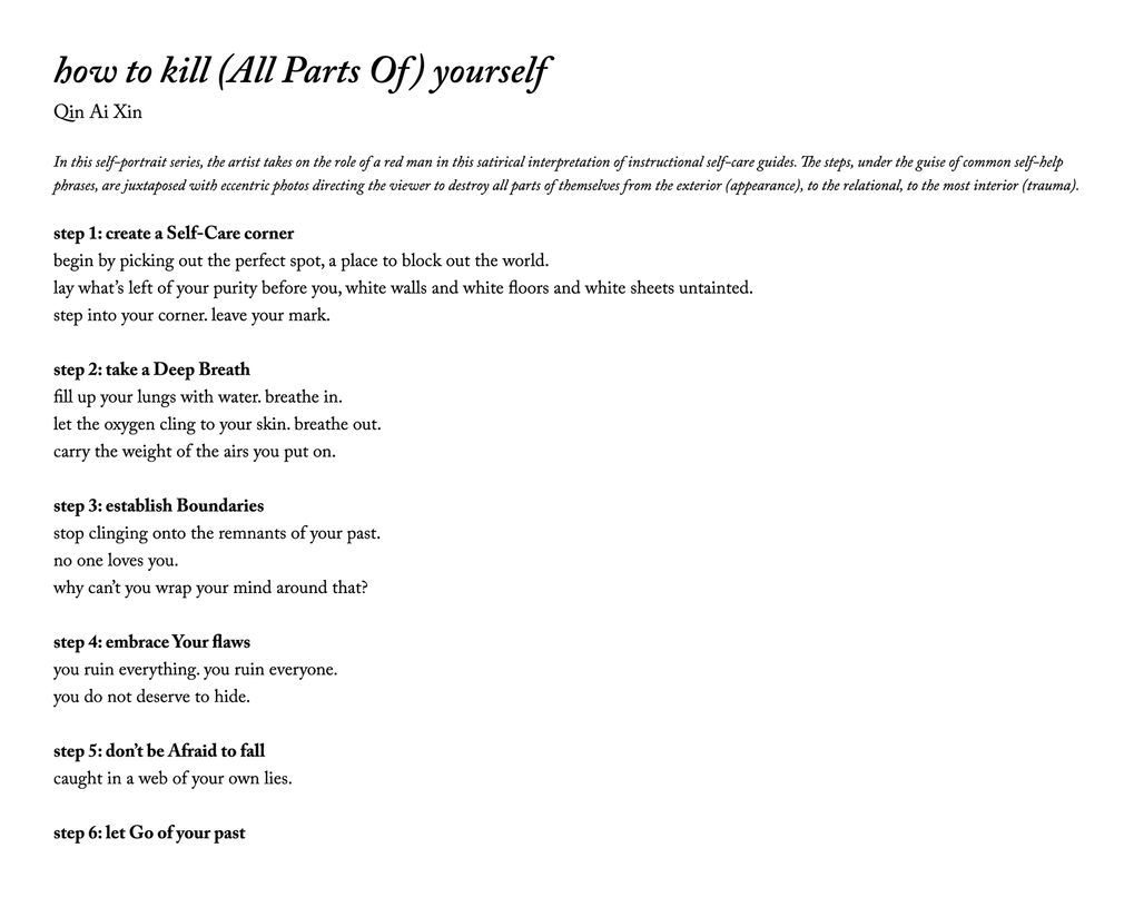 the steps, under the guise of common self-help phrases, are juxtaposed with eccentric photos directing the viewer to destroy all parts of themselves from the exterior (appearance), to the relational, to the most interior (trauma).